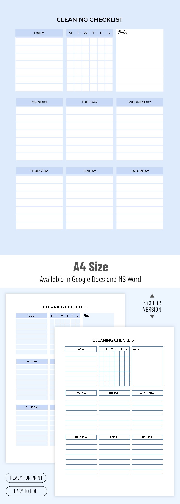- Separate tables for daily cleaning tasks and additional notes.