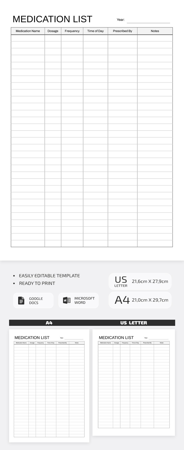 Our Printable Medication List Template is suitable for personal use as well as for clinics, hospices, and other healthcare facilities. It offers a standard black-and-white format with a simple table and without unnecessary design elements. Such a layout makes this template versatile and easy to use.