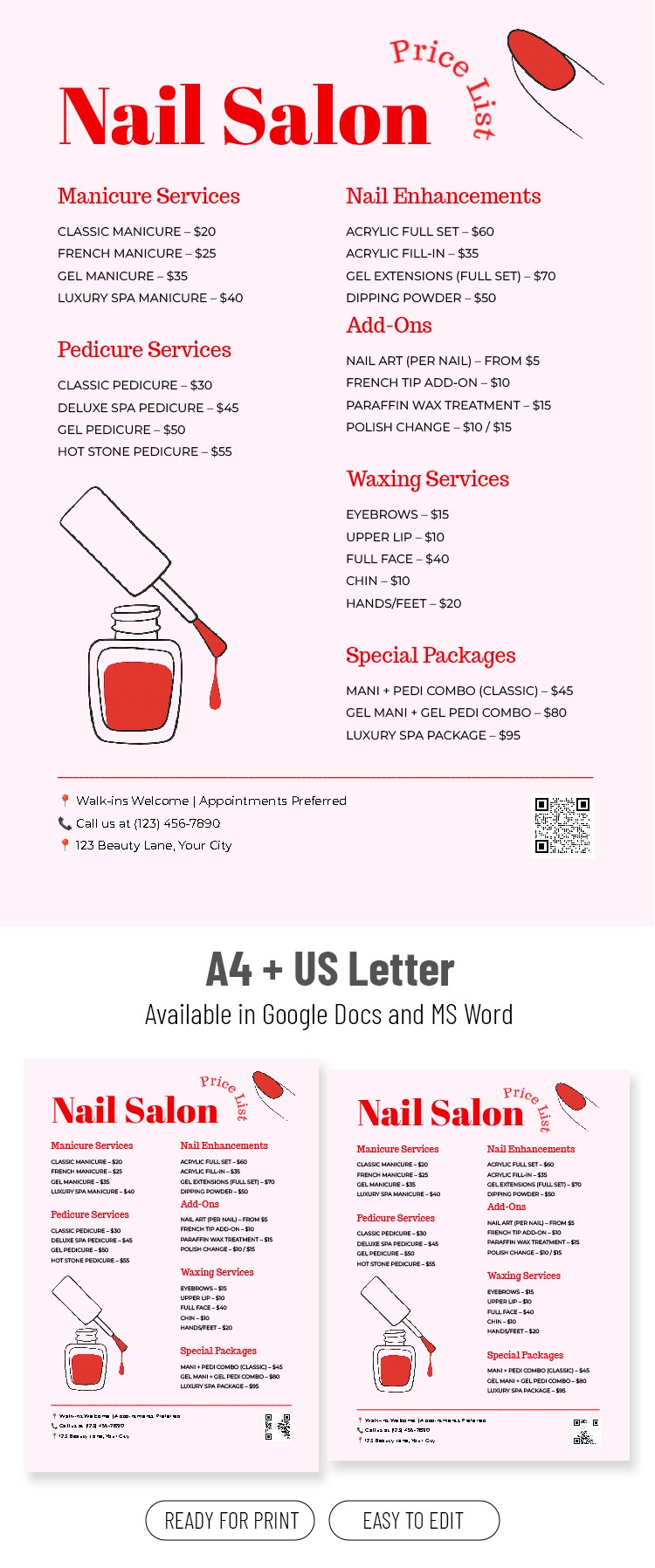 Manicurists, pedicurists, and nail salons will definitely appreciate our Nail Salon Price List Printable Template. You can fill it out and print it immediately in A4 or US Letter format, or even use it digitally. Create a professionally designed price list in minutes without wasting time or money with this free nail salon price list template.