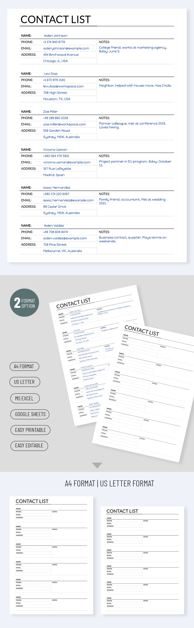 You can customize and fill out our list template in Excel or Google Sheets. Print it after completion or right after getting a copy or downloading it to enter contact details by hand. All print settings for A4 and US Letter portrait formats are included.