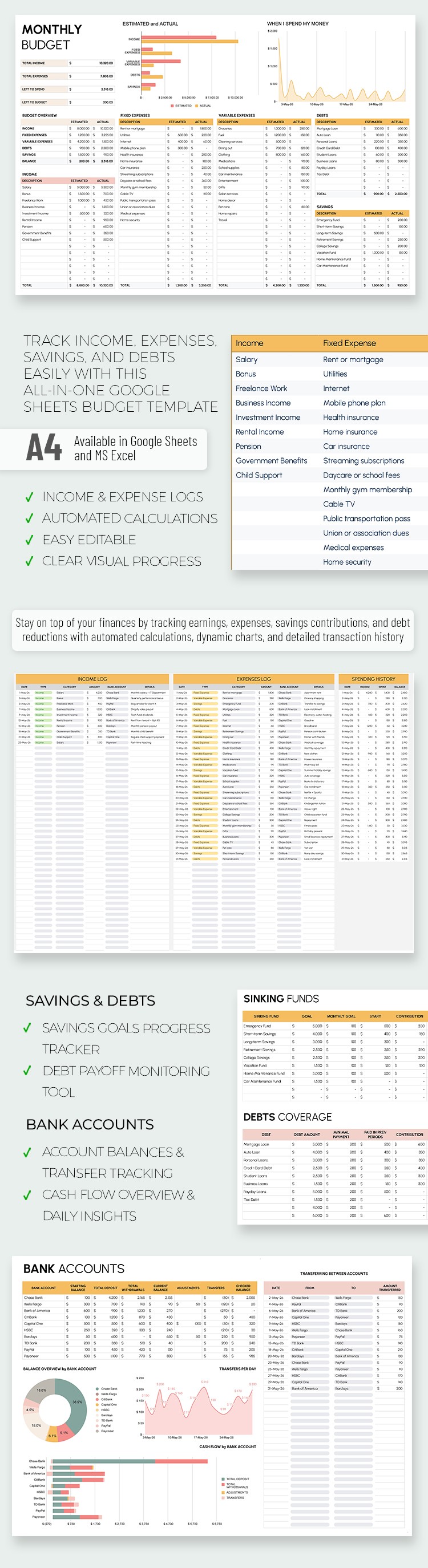 Modèle de feuille de calcul de budget mensuel modifiable | Suivi des factures, des dettes et des économies