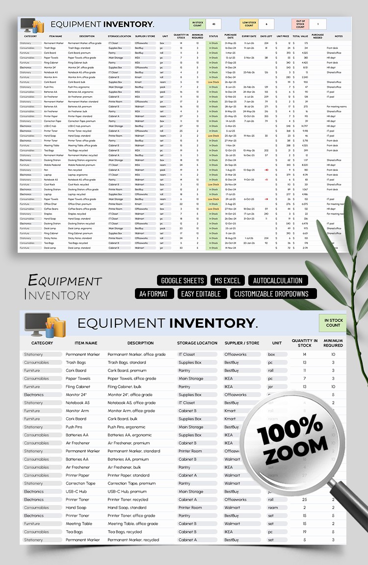 Our inventory template includes key fields for entering the equipment name, description, category, location, seller information, and other details. You will also automatically receive status indicators showing whether items are in stock, low on stock, or out of stock.