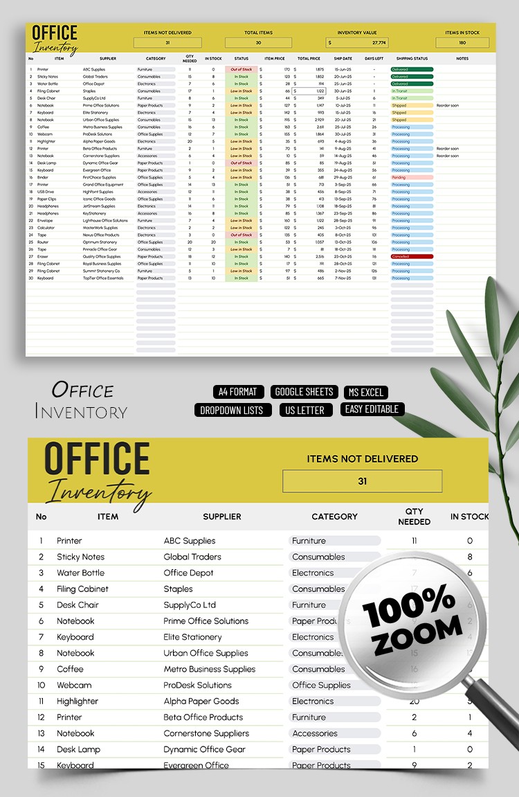 Our inventory template is available in convenient Google Sheets and Excel formats and consists of just one sheet. However, it is more than enough to record and store all your inventory data.