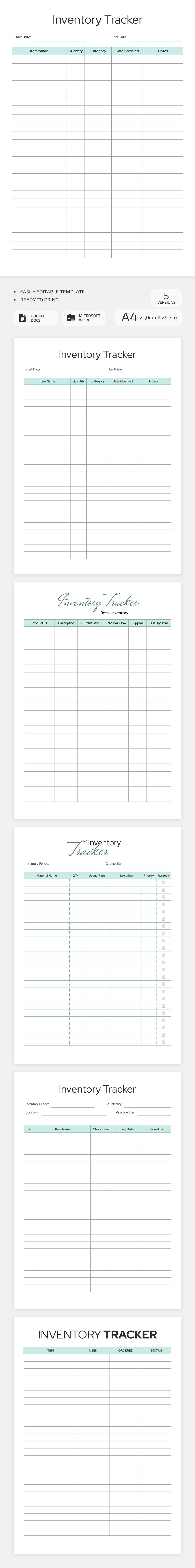 The template includes five versions, each with a unique layout. Different options include columns for stock level, responsible person, priority, and other details, so you’re sure to find the perfect blank for tracking your business’s items.