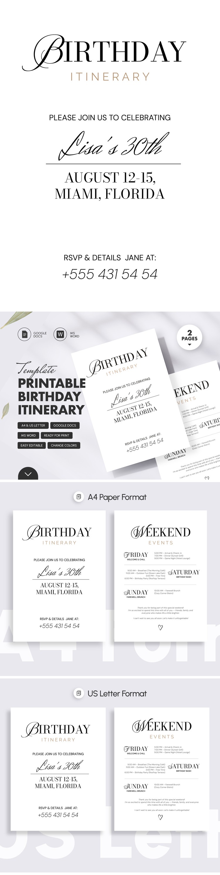 Invite all your friends to your birthday party and prepare a schedule! To do this, you can use our Vivid Birthday Itinerary template. The bright, very colorful design is perfect for both children and adults. You can use Google Docs to customize and fill out this birthday itinerary template.
