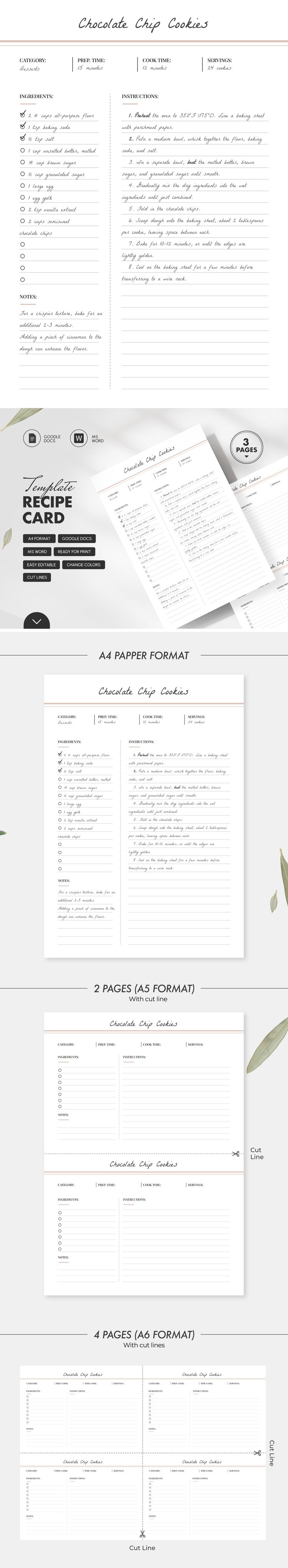 Our Google Sheets recipe template is available in A4, A5, and A6 formats with cut lines. Edit online with a manuscript or machine fonts, or inscribe it all by hand - it's up to you. Give it a try — it is perfect for your cookbook!