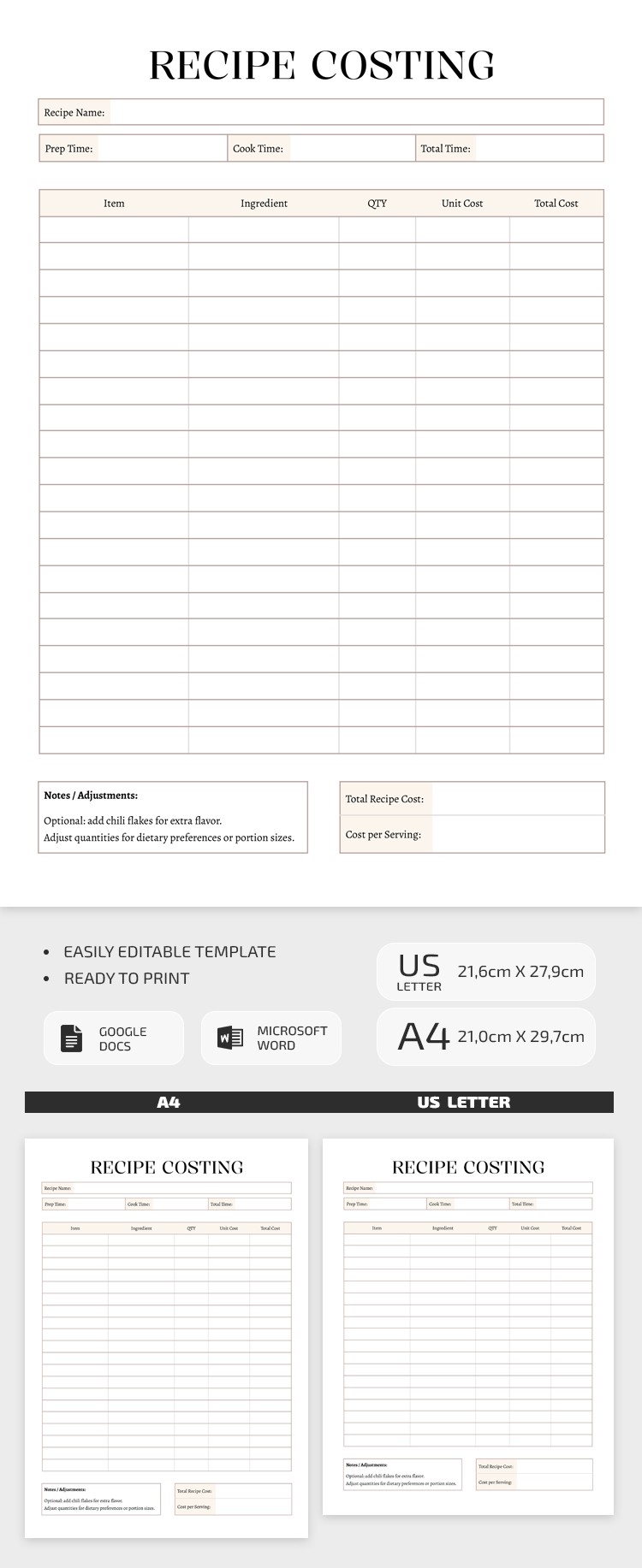 Simple Recipe Costing Template