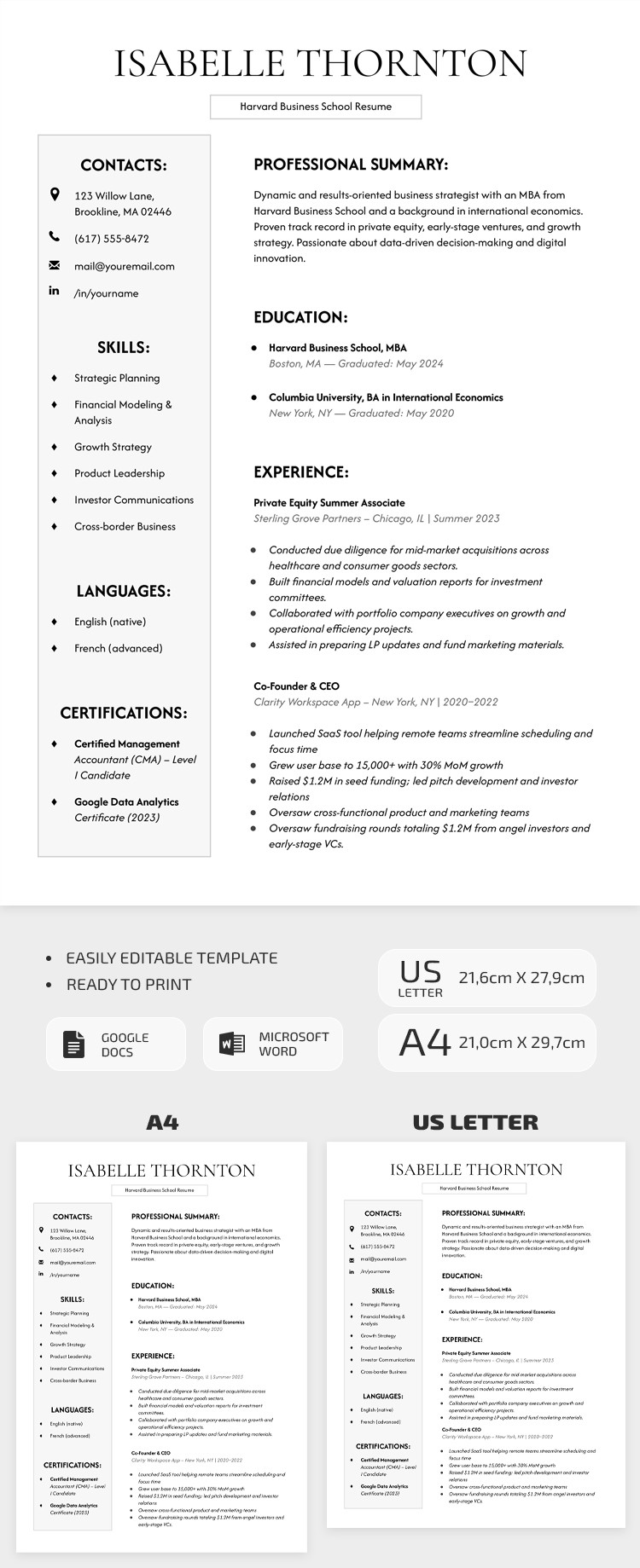 Our Classic Harvard Business School Resume Template meets all the strict requirements of this resume format. It features a clean structure without excessive details and the necessary blocks to present your candidacy to a potential employer.